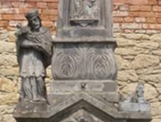 na reliéfně zdobeném pilíři a volutovém podstavci, s drobnými soškami sv.