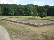 palisádovým plotem. Rozsáhlá trojlodní bazilika s atriem a nartexem –