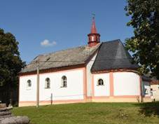 (Blosdorf) Kostel Nejsv.Trojice 1720-1910, na sakristii 1833, KP Fara Dnes MŠ s přístavbou Kaple Na rychtě
