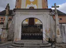 Reliéf sv.Rodiny Nad vchodem do kostela Kamenný kříž Před hřbitovní bránou
