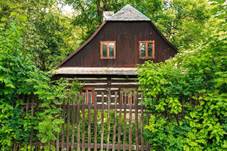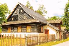 mohutnou kamennou podezdívku dosedají dřevěné trámy v nárožích spojené