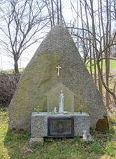 na Petrovice, velký kámen se zbytkem náhrobku a plastovou soškou P.Marie v umělohmotné skříňce z plexiskla,