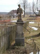Socha sv.Jana Nepomuckého Ve středu obce, 1910, F.Dvořák, se zbytkem železného plůtku Socha sv.Floriána Ve výklenku čp.2