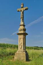 Beck z Prostějova Kamenný kříž Zdroj C) na návsi před kaplí z roku 1792, dříve zde stávaly