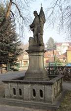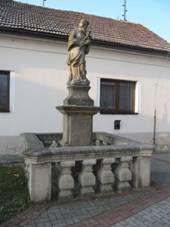 praporce. Hlava pootočena k pravému rameni. Socha sv.Jana Nepomuckého Zdroj A) 1730, Drobná