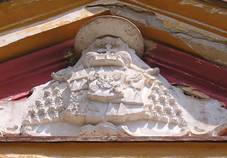 ozdoben šambránou a ušima se nachází segmentově vypjatá návojová římsa. Nad