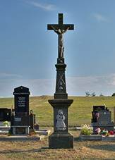 s reliéfem P.Marie Bolestné na podstavci Kamenný kříž Centrální, na hřbitově Škola Č.p.28