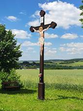 na Jelením vrchu jižně od vsi Kamenný kříž 1882, u kostela Kamenný kříž U hřbitovní zdi u kostela, před 1836, upraven 1911 Železný kříž na "Plátkách"