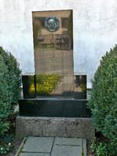 návsi. Nápis: RUDÉ ARMÁDĚ ZA OSVOBOZENÍ – ĆEST PADLÝM / 28.4.1945. Památník padlým 1914-18 1936 u severní zdi