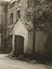střechou Kaple sv.Jana Nepomuckého S dřevěnou sochou světce [Kaplička] Vedle školy, zasažena pumou společně