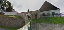 ulice, poblíž kostela. Ohradní zeď z pískovcových kvádrů, v níž je umístěna