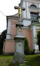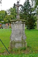 kamenný kříž ve vrcholu nahrazen litinovým, proti č.p.29, s reliéfem
