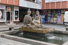 Sochy z pískovce zobrazují stojící muže se lví kožešinou a sukovitou holí. Kašna V zámeckém parku. se sousoším puttů v novobarokním slohu