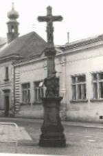 socha zničena 1945, železný poválečný křížek nahrazen kamenným Socha sv.Floriána