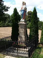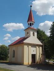 zvonice přebudována v roce 1874 na kapli. Socha P.Marie Hostýnské Před obcí u silnice