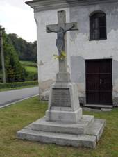 Socha Jana Evangelisty Na ohradní zdi kolem kostela Socha Bolestné P.Marie Na ohradní zdi kolem kostela Kamenný kříž Centrální na hřbitově Kamenný kříž 1875