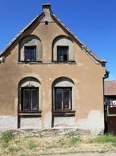 "L", krytá strmou sedlovou střechou. Ve střední části je kamenný