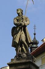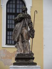 Socha sv. Vendelína Na pilíři hřbitovní zdi u kostela, od
