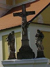 Sousoší Kalvárie Na pilíři hřbitovní zdi u kostela, od