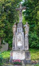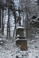 kartuší Kamenný kříž -Kalvárie U kostela, 1877, se sochami na bocích Kamenný kříž Na hřbitově před kaplí Kamenný kříž Zv.Hartlův,
