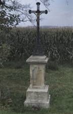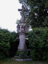 Kamenný kříž u silnice v centru obce. S reliéfyna čelní straně, na