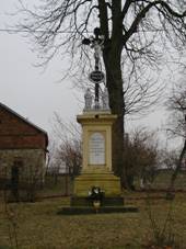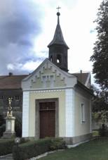sedlové střeše. Železný kříž u kapličky. S reliéfem sv.J.Nepomuckého