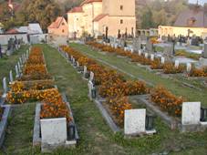 křížové cesty končící kaplí Božího hrobu. Nová část hřbitova v horní