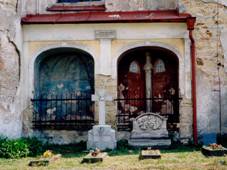 Hřbitov Za kostelem. Stará část je obklopena zdí s výklenky ve kterých jsou umístěny reliéfy náhrobků a