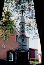 Brána na hřbitov Neogotická, 1856, se sochami P.Marie, sv.Filomeny, sv.Jakuba