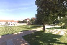 od zámku, rozšířená o čtvrtě rodinných domků Zahájí, městská část přibližně na