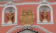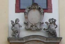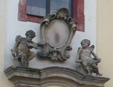 ozdobné kartuše Na piaristickém kostele Socha
