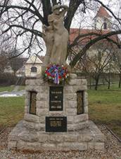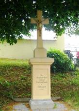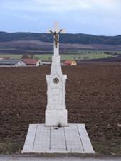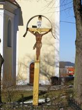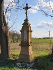 Kamenný kříž u vchodu na hřbitov. Autor František