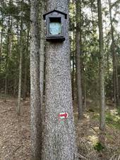 s reliéfem P.Marie Bolestné Svatý obrázek ˘na stromě u lesní cesty na západní