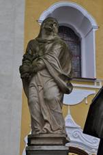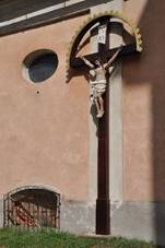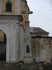 Reliéf sv.Rodiny Nad vchodem do kostela Kamenný kříž Před hřbitovní bránou