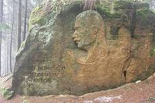 pod hradiskem jsou vytesány reliéfy zpodobňující básníka Petra Bezruče (z r.