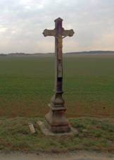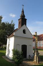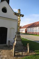 Kaple P.Marie Královny 19.stol. Výklenková kaplička Se sochou Krista Kamenný kříž Před kaplí Kamenný kříž U silnice na Plačovice