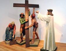 rozpažených rukou kříž, který k němu vztyčuje dvojice biřiců. Skupinu