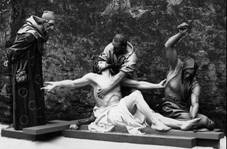 vyjadřuje hloubku okamžiku. Kompozici skupiny dotváří voják stojící s kopím v