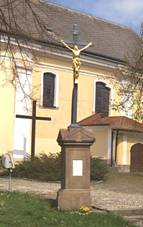 křtitelnice z roku 1490, před kostelem socha sv. Jana Nepomuckého z roku 1744