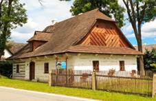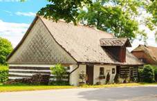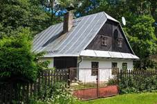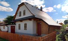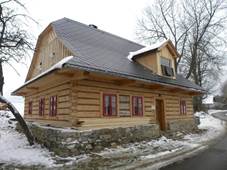 mohutnou kamennou podezdívku dosedají dřevěné trámy v nárožích spojené