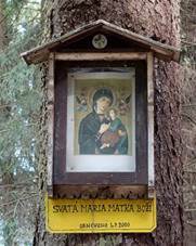 na Petrovice, velký kámen se zbytkem náhrobku a plastovou soškou P.Marie v umělohmotné skříňce z plexiskla,