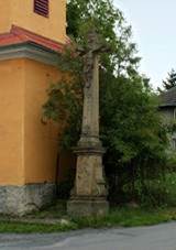 (Heinzendorf) Kaplička … Socha P.Marie U č.p.72 Kamenný kříž U kapličky, s reliéfem P.Marie Bolestné na podstavci Kamenný kříž Proti čp.73