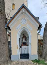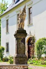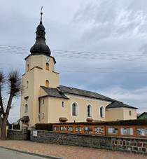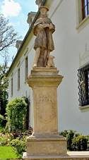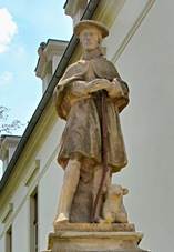 kostelem se sochou sv.Jana Nepomuckého a nápisem Padlým vojínům