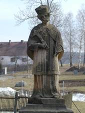 Socha sv.Jana Nepomuckého Ve středu obce, 1910, F.Dvořák, se zbytkem železného plůtku Socha sv.Floriána Ve výklenku čp.2