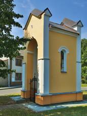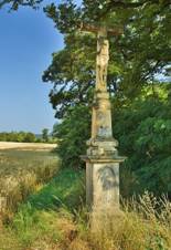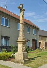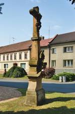 Beck z Prostějova Kamenný kříž Zdroj C) na návsi před kaplí z roku 1792, dříve zde stávaly