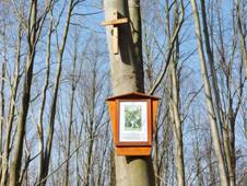 Do Ondřejova, dřevěné destičky na stromech s tištěnými obrázky