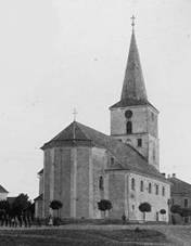 Kamenný kříž - Kalvárie C) U kostela, 1879, se sochami P. Marie