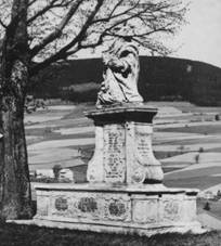 sochařská práce z roku 1780, kolem sochy pískovcový parapet s nápisy
