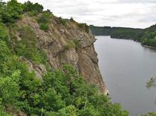 přehradou, od roku 1556 uváděn jako pustý, terénní pozůstatky Velkostatek … Škola … [Mlýn] Kuchyňkův, zatopený Dům č.p.123 … Wilsonova skála skálou nad vodní nádrží Dalešice, sahá taktéž hluboko pod její