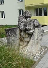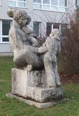 a přestavěná na konci 30. let 20. stol. nese na pilíři plastiku sedícího